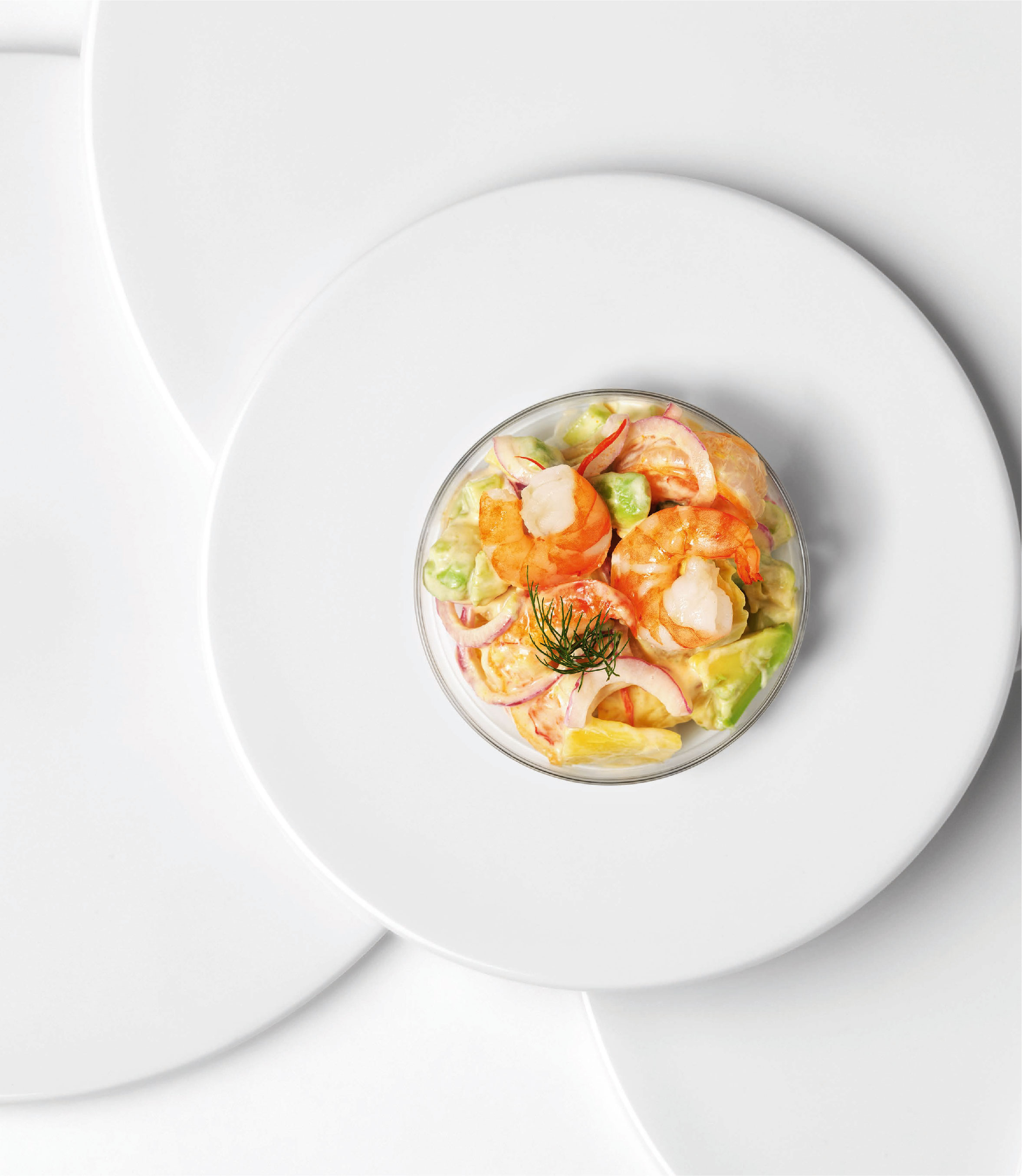 Abschließend die Garnelen mit der Sauce vermengen, mit Ananas, Avocado, Zwiebel und Gurke anrichten und mit frischer Dille servieren. |
