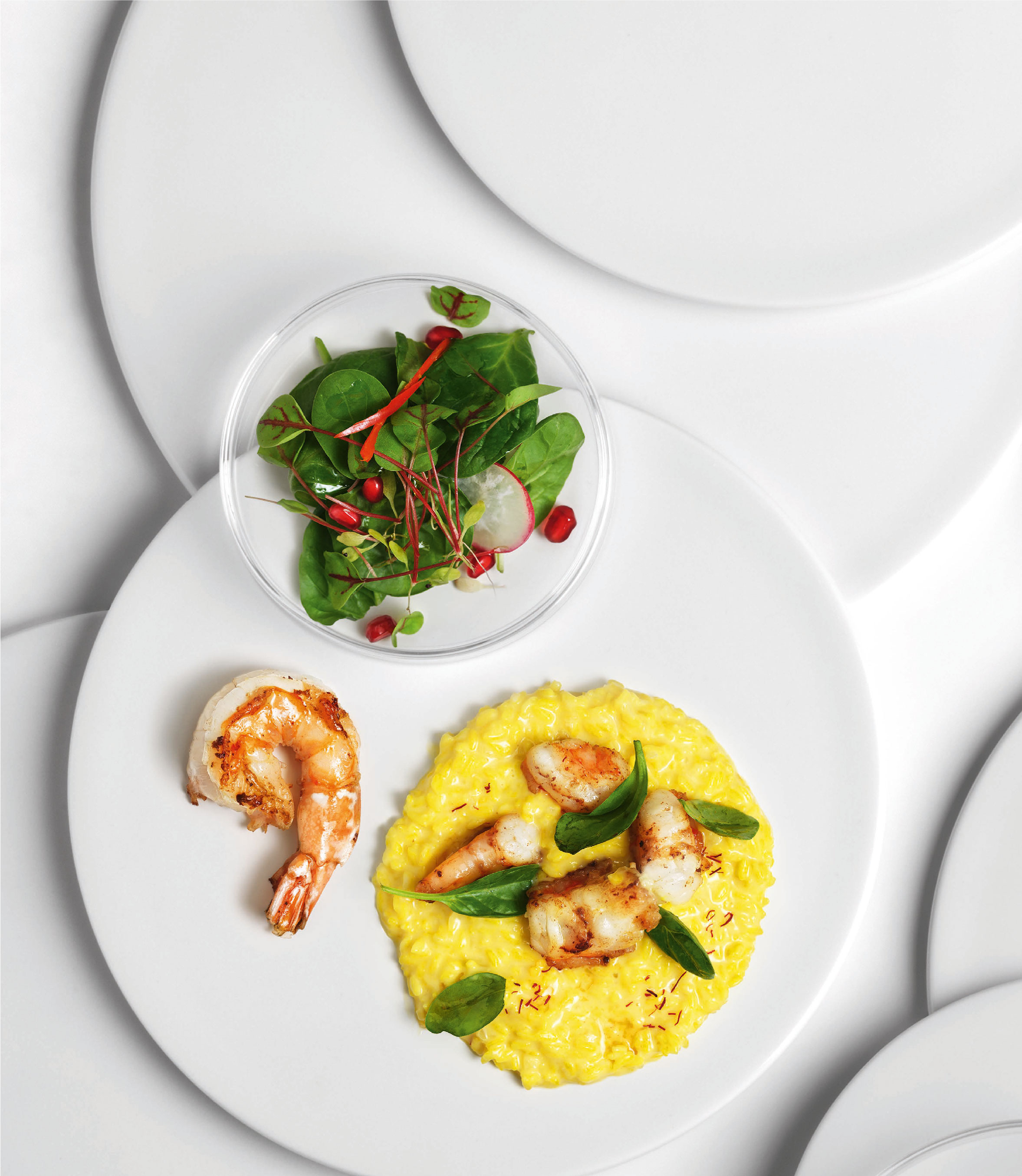 ca. 400 g Garnelen 200 g Risotto-Reis 2 mittelgroße Schalotten 6 dl Wasser 1/2 Würfel Hühner- bouillon 50 g Parmesan, gerieben 2 EL Butter Safranfäden 2 dl Weißwein zum Ablöschen 50 g Butter 1 dl Weißwein 1 EL Butter 1 Handvoll Blattspinat Pfeffer, gemahlen Salz | Schalotten schälen und fein hacken. Den halben Würfel Hühnerbouillon in warmem Wasser auflösen. Die Bouillon sollte nicht zu salzig und eher warm sein. Parmesan reiben, Schlagobers schlagen und kühl stellen.