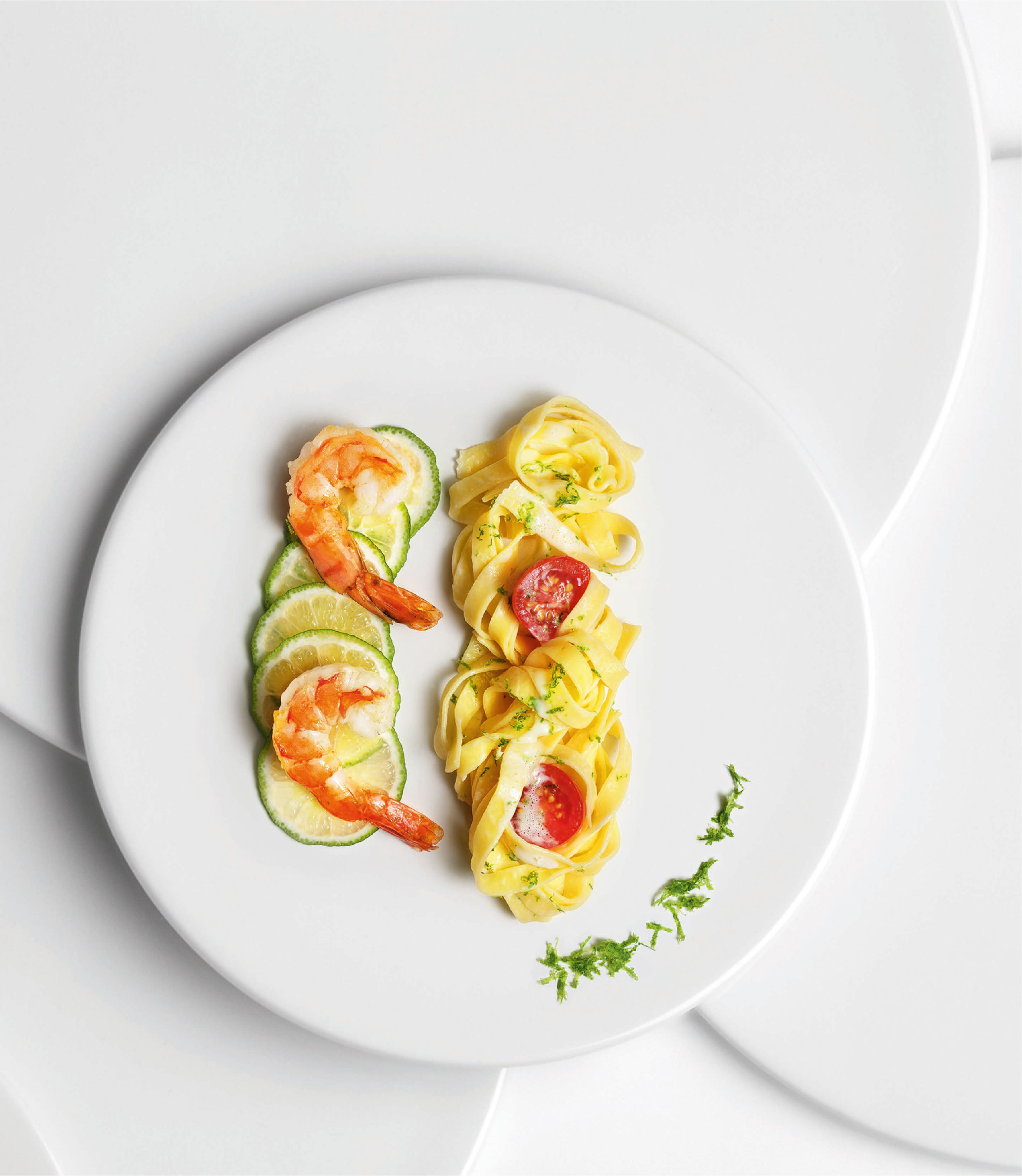 ca. 300 g Garnelen 250 g Tagliatelle 1 Limette 1 kleine Zwieben 50 g Butter 1/8 l Weißwein 200 ml Schlagobers 200 ml Gemüsebrühe 100 g Parmesan 80 g Schlagobers Salz Pfeffer, gemahlen 2 EL Olivenöl 1 Zehe Knoblauch 8 Cherrytomaten | Limette reiben und pressen. Zwiebel schälen und in kleine Würfel schneiden. In Butter glasig anschwitzen und mit Weißwein ablöschen. Mit Schlagobers köcheln lassen. Limettesaft und -abrieb hinzufügen und mixen. Parmesan in feine Späne hobeln, Schlagobers schlagen und kühl stellen. Tagliatelle in leicht gesalzenem Wasser al dente kochen und abseihen.